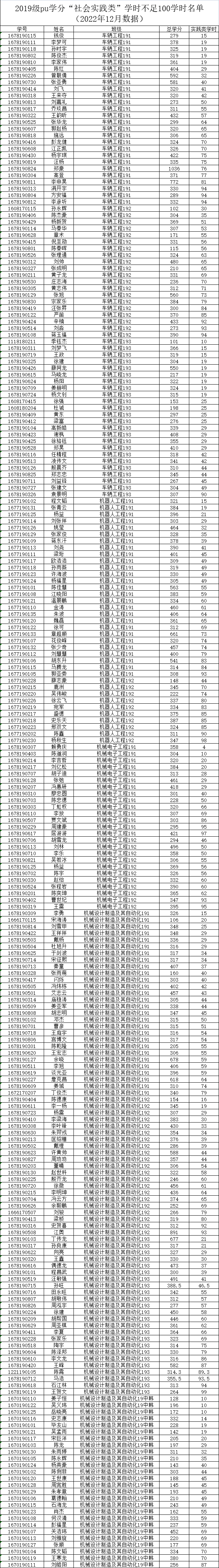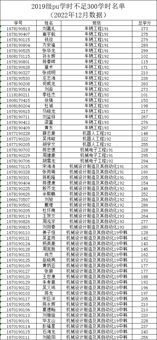 机械工程学院2022-2023-1学期二课堂学分(PU)未达标名单公示(2019级)