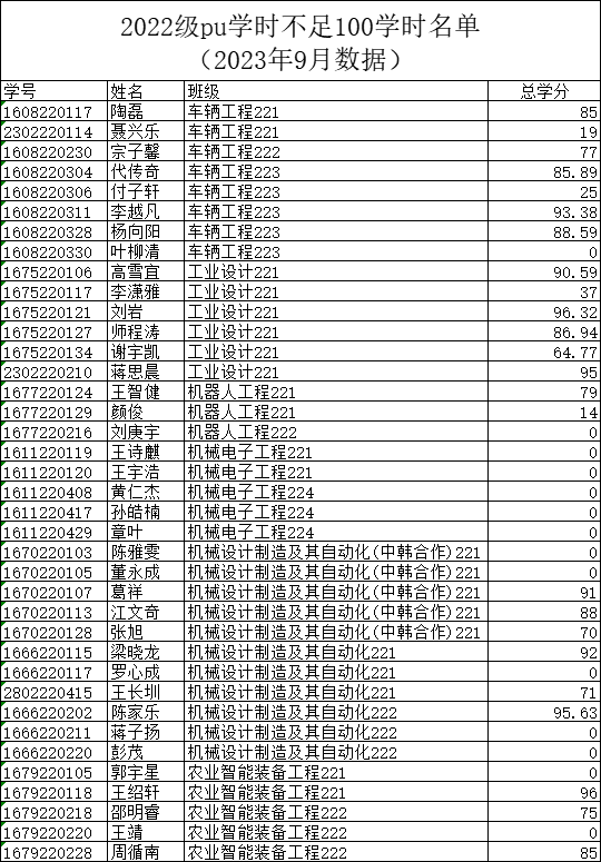 机械工程学院2023-2024-1学期二课堂学分(PU)未达标名单公示(2020级、2021级、2022级)