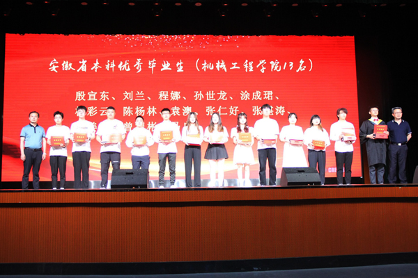 在毕业典礼暨欢送晚会现场,张程宣读了安徽省教育厅、人力资源和社会保障厅、共青团安徽省委联合下发的关于表彰高校2022届优秀毕业生的决定,其中:机械工程学院共有13名学子获评为2022年“安徽省本科优秀毕业生”,陈丰、张严政为13位优秀学子颁发了荣誉证书和纪念品,同时对荣获“云博网页版优秀毕业生”的45名机械学子进行了表彰。