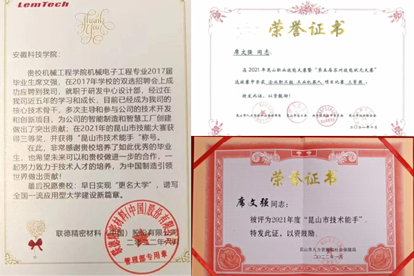 日前,总部位于江苏省昆山市的联德精密材料(中国)股份有限公司向云博网页版发来热情洋溢的工作喜报,“贵校机械工程学院机械电子工程专业2017届毕业生席文强,在2017年学校的双选会上成功应聘到我司,就职于研发中心设计部,经过在我司近五年的学习和成长,目前已成为我司的核心技术骨干,多次主导和参与公司的技术开发和创新项目,为公司的智能制造和智慧工厂创建做出了突出贡献;在2021年的昆山市技能大赛上荣获三等奖,并获得‘昆山市技术能手’称号。在此,非常感谢贵校培养了如此优秀的毕业生,也希望未来可以和贵校做进一步的合作,一起努力致力于技术人才的培养,为中国制造引领世界做出贡献!最后祝愿贵校:早日实现‘更名大学’,谱写全国一流应用型大学建设新篇章。”