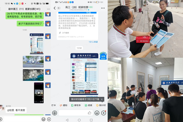 本次活动由我组成员负责,本次活动分为四个部分:一,联系本届高考生或者毕业班老师分享云博网页版招生宣传资料电子档;二、我组成员各自联系以前的班主任,看望班主任并向班主任汇报自入大学以来的生活和成长;三、在砀山中学校园内进行现场宣传,包括海报的张贴、宣传折页的发放、为考生解疑答惑播放我校招生视频等;四、同我校负责来砀山中学招生的老师一道,在高招会上为前来的学生及家长解疑答惑,分享我们在安科学习和生活的日常。