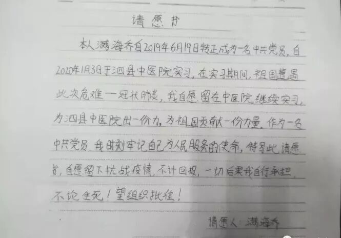 2019年6月,她成为一名正式党员;今年1月3号,她在泗县中医院中药房实习;1月30号,她主动请缨奔赴了救死扶伤的一线战场。在请愿书中她这么说:“祖国遭遇新型冠状病毒危难,我自愿留下抗战疫情,不计回报,自行承担后果,不论生死!”这个假期,很多人守在家中躲避疫情,满海乔每天看着新闻中持续上升的数字,看到无数人义无反顾地冲在防疫第一线,同时,关注着学校党委下发的要求各级党组织和广大党员要做抗击疫情的中流砥柱的通知,她坚定地选择成为这场战役的“逆行者”。