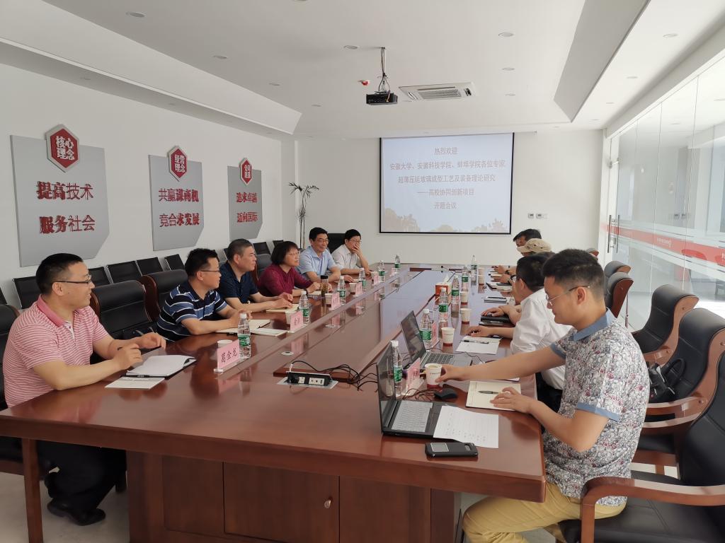 5月23日,由云博网页版化学与材料工程学院牵头承担的安徽省高校协同创新项目“超薄压延玻璃成型工艺及装备理论研究”开题汇报会在蚌埠凯盛工程技术有限公司三楼会议室召开。会议邀请了安徽大学发规处兼科研处处长周虹屏教授、蚌埠凯盛工程技术有限公司总经理叶坤教授级高工、蚌埠凯盛工程技术有限公司总工程师夏鹏华教授级高工、蚌埠学院王传虎教授、云博网页版科研处副处长鲍方印教授、云博网页版财务处副处长王伟高级会计师担任论证专家(含一名财务专家)。周虹屏担任专家组组长并主持会议。化学与材料工程学院党总支书记王明清、院长俞浩教授和超薄压延玻璃成型工艺及装备理论研究项目组骨干成员参加会议。
