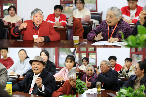 康守智老人向母校献诗两首,并向青年学生分享“读书能改变人生”的永恒真理;王秀云老人向同学们讲述了自己的一生坎坷经历,对于自己的坎坷,老人家说“感谢党和人民,没有党和人民的关怀,自己就没有这么美好的生活,同学们一定要有一颗报国心强国志,发扬吃苦耐劳精神,用自己的所学所用报效国家,报效人民!”王秀文老人给青年学生展示了“实践出真理,斗争长才干”的现身说法;黄士尧老人告诉青年学生“农业是国民经济的基础,农业大有可为,大有作为,一定要好好干认真学,学农爱农兴农,发扬为农业献身精神”。