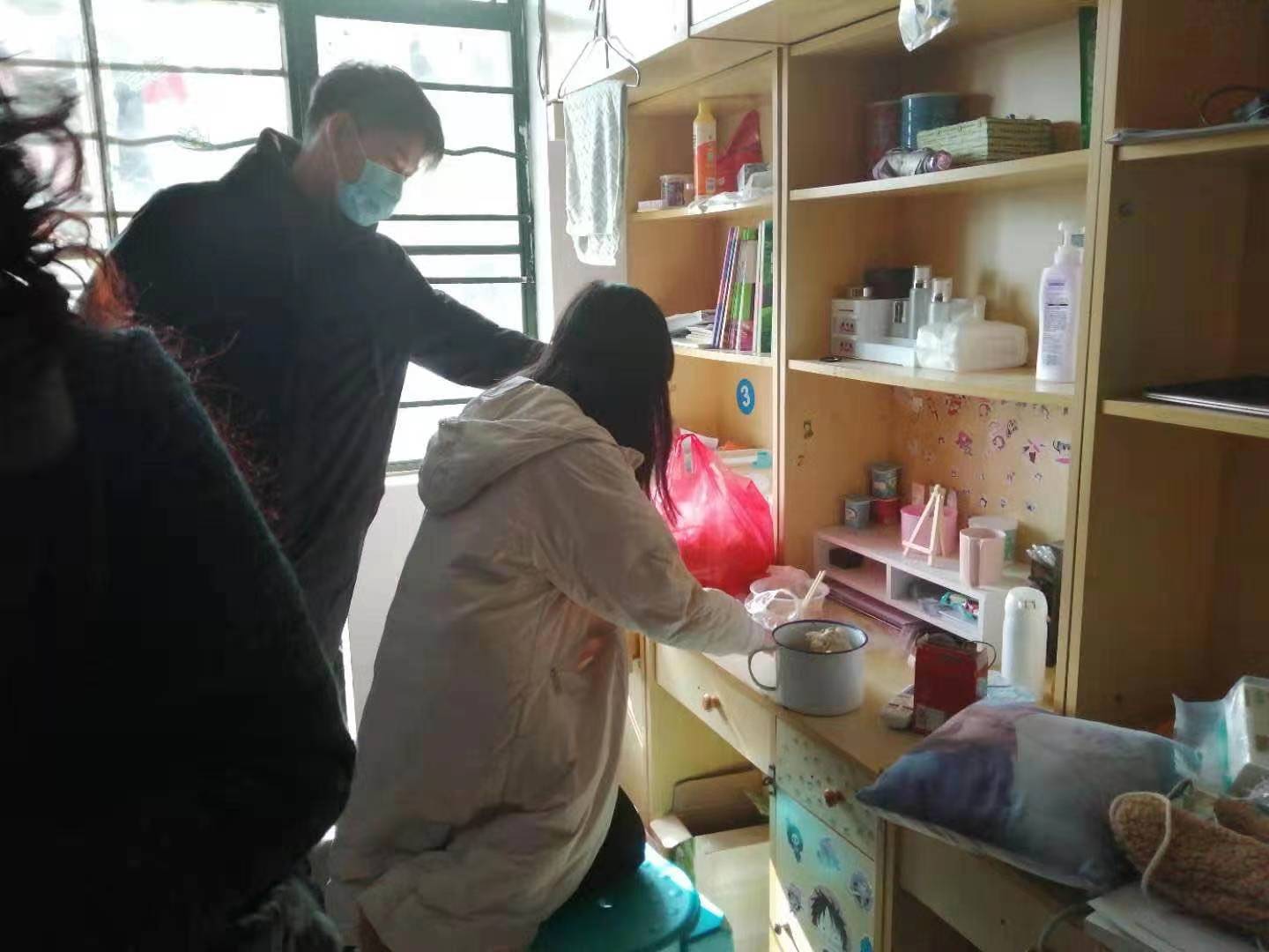 西园1号楼一位男生因打球脚受伤,宿管到宿舍看望,并给他带去了骨头汤,叮嘱他好好养伤,有困难随时打宿管电话。