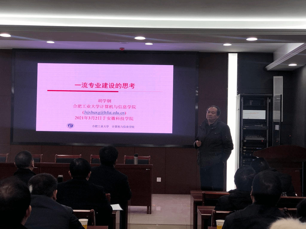 报告会上,胡学钢从国家一流本科专业的建设任务、建设原则、建设方式等方面,详细解读了教育部“双万计划”政策文件。他围绕专业定位、专业特色、人才队伍、人才培养等,对国家一流专业申报要点进行了深入浅出的阐析,对申报过程中需要注意的细节给出许多具有建设性的建议。胡学钢还对工程教育认证的标准、认证流程等模块内容进行了系统性讲解,并对在工程教育认证工作中可能出现的问题给出了具体的建议。