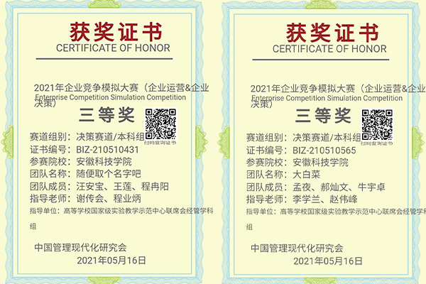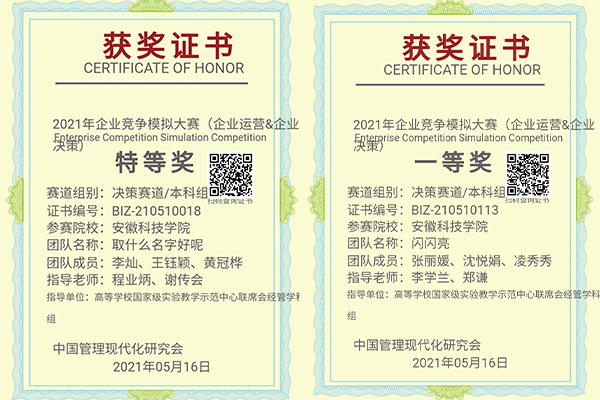 5月16日,从天津工业大学承办的全国企业竞争模拟大赛总决赛传来喜讯,我校代表队荣获特等奖1项(李灿、王钰颍、黄冠桦团队)、一等奖1项(张丽媛、沈悦娟、凌秀秀团队)、三等奖2项(孟夜、郝灿文、牛宇卓团队和汪安宝、王莲、程冉阳团队),取得此类学科赛事的历史突破。