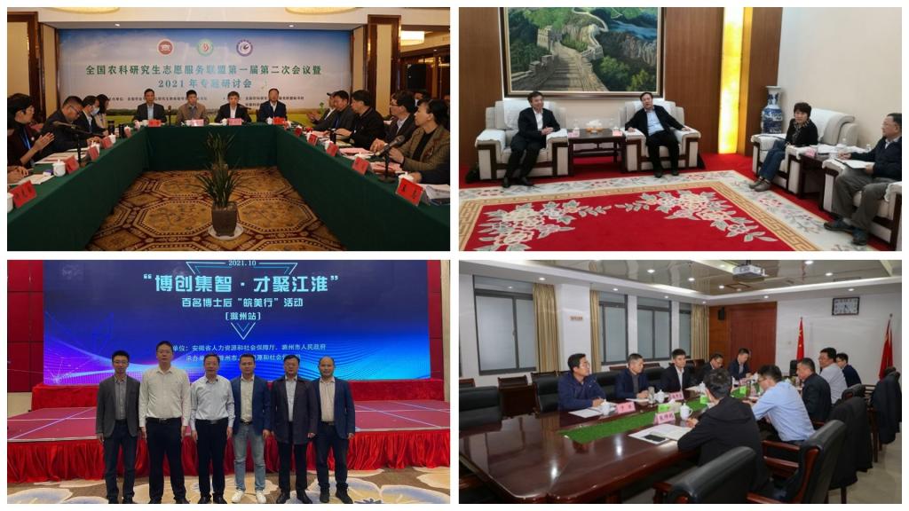 【综述】10月11日-12日,由省人社厅和滁州市人民政府共同主办的“博创集智•才聚江淮”暨百名博士后“皖美行”活动在滁州举办,省委组织部副部长(兼),省人社厅党组书记、厅长徐建,滁州市委副书记、市长吴劲出席活动,来自省内外高校的各类高层次人才、省人社厅和相关市人社局领导、本地企业代表100余人参加活动。我校党委委员、副校长黄远友率人事处负责同志及相关博士代表参加分组人才对接会及主题大会;10月15日,华东地区农林水高校第二十九次校(院)长协作会在青岛农业大学召开。来自云博网页版、青岛农业大学、南京农业大学、上海海洋大学、浙江农林大学等16所华东地区农林水院校的领导出席,校党委书记蒋德勤受邀参会。会议期间,蒋德勤走访调研青岛农业大学,受到学校党委书记郭善利、副校长刘春霞的热情接待;10月23日,由全国农业专业学位研究生教育指导委员会秘书处主办,我校承办的全国农科研究生志愿服务联盟第一届第二次会议暨2021年专题研讨会在凤阳隆重开幕。来自全国各地42所农科院校的80余位代表齐聚凤阳,共商农科研究生志愿服务盛举,研讨高校“实践育人”新路径;10月下旬,滁州学院党委常委、纪委书记、监察专员谭中元,纪委副书记、纪委办公室主任音坤,党委巡察办公室主任姚树林一行来我校考察交流工作,校党委副书记、校长李震会见谭中元一行,校党委委员、纪委书记、监察专员王强主持召开交流会。谭中元一行还参观了龙湖校区校史馆。