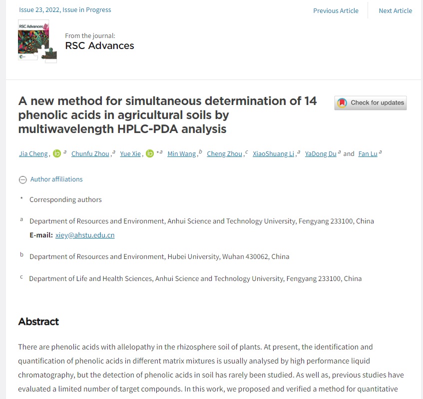 5月18日,英国皇家化学学会期刊RSC Advances(Impact factor:3.361)在线发表了资源与环境学院固体废物资源化研究所谢越教授团队题为“A New Method for Simultaneous Determination of 14 Phenolic Acids in Agricultural Soils by Multiwavelength HPLC-PDA Analysis”的研究论文(https://doi.org/10.1039/D1RA09433E)。该论文报道了采用HPLC-PDA多波长的方法同时测定农业土壤中14种酚酸类物质,为农业土壤中复合酚酸物质同时分析提供了新的技术手段。