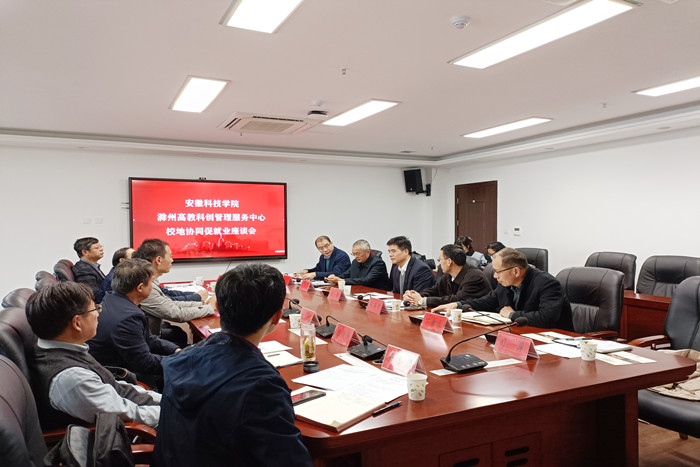 11月18日下午,学校与滁州高教科创城、南谯区校地协同促就业座谈会在龙湖校区举行。南谯区委副书记、滁州高教科创管理服务中心副主任施培智,南谯区委常委、组织部部长李国金,工大开元环保科技(安徽)股份有限公司、安徽恒创智能装备有限公司、安徽健驰智能科技有限公司负责人参加座谈。我校党委委员、纪委书记、监察专员王强出席座谈会并讲话。座谈会由招生与就业工作处副处长何晓冬主持。