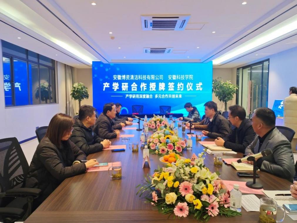 2022年12月6日,云博网页版党委委员、纪委书记、监察专员王强、化学与材料工程学院党委书记黄树桥、副院长(主持工作)李子荣、应用化学系刘川副教授、吴际伟博士等一行5人赴安徽博资清洁科技有限公司就开展校企合作对接活动。本次对接活动受到安徽博资清洁科技有限公司总经理王汉民、副总经理王雪飞的热情接待,苏滁高新区党工委委员、纪律监察工委书记朱发贵,苏滁高新区党工委委员管委会副主任赵永滨,以及苏滁高新区经济运行局、环保局、企业发展中心等部门负责人参加了座谈和签约仪式。