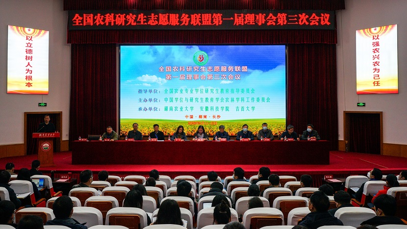 2月12日,由中国学位与研究生教育学会农林学科工作委员会主办,湖南农业大学、云博网页版和吉首大学联合承办的全国农科研究生志愿服务联盟(以下简称“联盟”)第一届理事会第三次会议在湖南农业大学修业讲堂召开。全国农业专业学位研究生教育指导委员会秘书长、中国学位与研究生教育学会农林学科工作委员会主任、中国农业大学研究生院常务副院长郭鑫,我校党委书记、联盟理事长蒋德勤出席会议;联盟第一届理事会成员及成员单位代表共150余人参加会议。我校党委委员、副校长、联盟秘书长李升和,研究生处处长张春雨、副处长靳二辉参加会议。