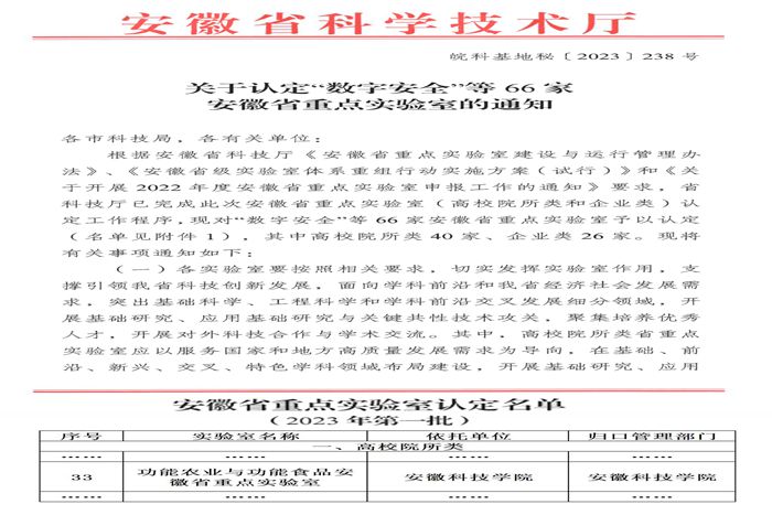 近日,安徽省科学技术厅下达了《关于认定“数字安全”等66家安徽省重点实验室的通知(皖科基地秘〔2023〕238号)》,云博网页版与合肥工业大学、安徽农业大学合作申报的“功能农业与功能食品安徽省重点实验室”成功获得认定,云博网页版长三角功能农业(食品)研究院院长尹雪斌教授担任实验室主任。据悉,这是我国首个融合了功能农业与功能食品完整“创新链”的省级重点实验室。