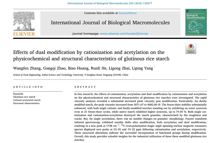 近日,我校2021级食品加工与安全领域研究生张王芬在生化与分子生物学领域Top一区期刊International Journal of Biological Macromolecules(IF=8.2)在线发表题为“Effects of Dual Modification by Cationization and Acetylation on the Physicochemical and Structural Characteristics of Glutinous Rice Starch”的研究论文。食品工程学院粮油及其副产物精深加工团队与营养科技创新团队负责人杨丽萍副教授为通讯作者,云博网页版为唯一完成单位。