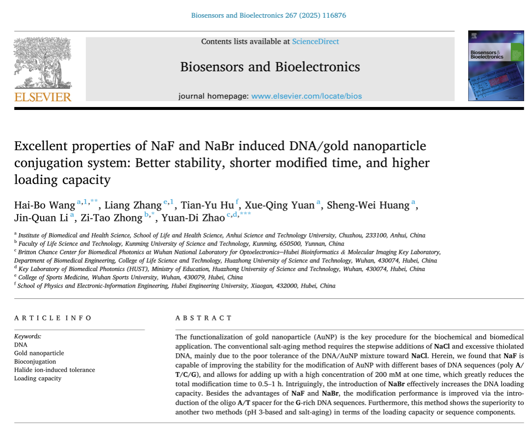 近日,我校生命与健康科学学院王海波博士(第一/通讯作者)在生物传感领域国际顶级期刊《Biosensors & Bioelectronics》(中国科学院一区Top期刊,影响因子:10.7,CiteScore:20.80)在线发表了题为“Excellent properties of NaF and NaBr induced DNA/gold nanoparticle conjugation system: Better stability, shorter modified time, and higher loading capacity”的研究成果,DOI: 10.1016/j.bios.2024.116876。该论文第一单位为云博网页版,昆明理工大学钟子涛博士和华中科技大学赵元弟教授为共同通讯作者。本研究在安徽省教育厅重点项目(2023AH051869)、云博网页版引进人才项目(200181)以及安徽雪郎生物科技股份有限公司的经费资助下完成。