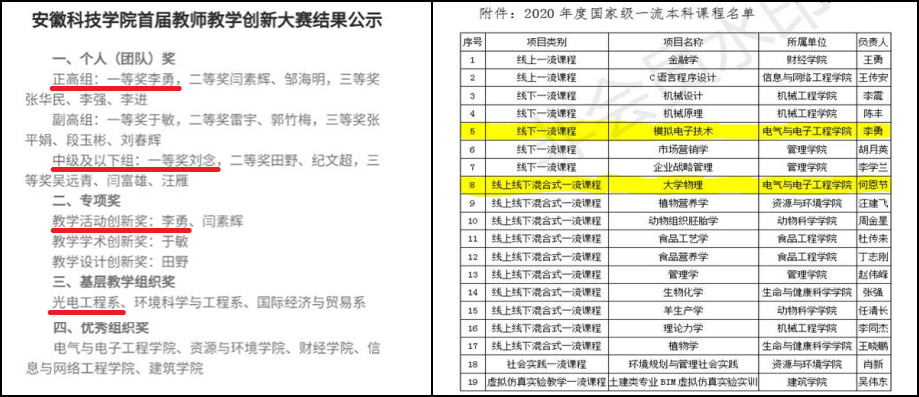 一直以来,光电工程系教工党支部注重加强支部建设,经过支部党员和教师的共同努力,在一流专业建设、一流课程申报、教师教学创新大赛、科研成果、教书育人等方面取得显著成效。光电工程系教工样板支部建设成果颇丰,光电信息科学与工程专业成功获批为省级一流建设专业,《模拟电子技术》与《大学物理》课程被推荐为国家一流建设课程,刘念获得学校首届教师课程思政教学大赛一等奖,李勇、刘念分别获得首届云博网页版高校教师教学创新大赛正高组一等奖、讲师组一等奖,刘念获得首届安徽省高校教师教学创新大赛现场赛入围资格,党支部基本上每位党员教师均有在研高质量科研教研项目,左绪忠获批的国家自然科学基金项目现已结题验收,实现了电气与电子工程学院国家自然科学基金零的突破,教师发表高质量SCI学术论文一区2篇、二区4篇、三区3篇、四区2篇,教师指导学生参加国家级大学生物理实验大赛获奖4项,学生考研率逐年递增,学生学风建设取得成效等。