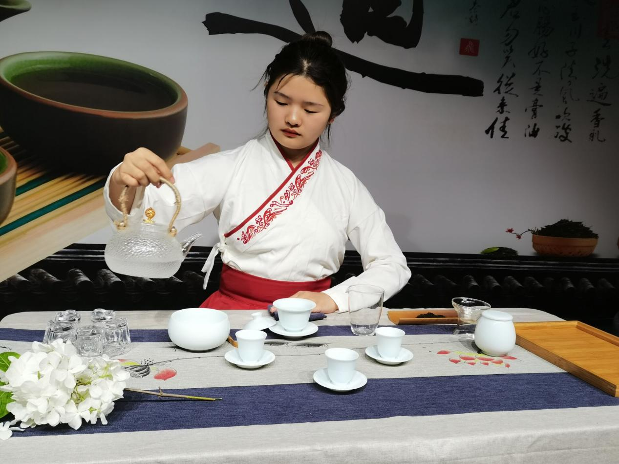 创意茶艺表演上,参赛选手们或着白裙西服,或着长衫汉服,依次对不同种的泡法茶艺进行了展示。聆音“茶”理队通过类似情景剧的表演方式将脱贫攻坚与红茶的雅趣、厚蕴相结合,团队成员间配合默契,行云流水般的茶艺表演和各具特色的才艺展示,使人仿佛身临其境,回味无穷。而个人赛孙晓雨选手的禅茶表演更是让人眼前一亮,不同于红茶的醇厚,绿茶的清冽在她干净利落的动作、轻柔的手法间展现地淋漓尽致,充分传递出传统茶艺之美。