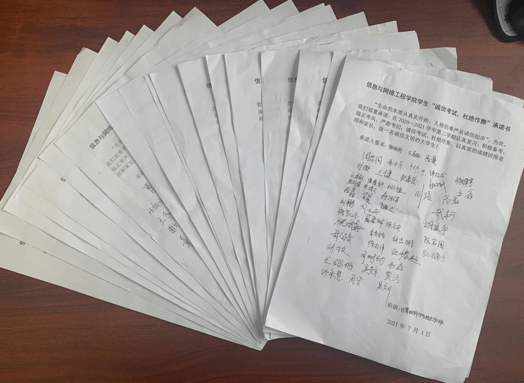 为确保将主题班会落到实处,学院专门制定《信息与网络工程学院考风考纪教育主题班会提纲》,准备了相关会议资料,要求各班辅导员按照提纲的内容和要求认真落实,精心准备。主题班会上,全体同学共同学习了《学生手册》中《云博网页版考试工作实施细则(节选)》及《云博网页版学生违纪处理方法》,开展了警示教育,按照《信息与网络工程学院诚信考试倡议书》的内容,发出了诚信考试倡议,希望同学们树立底线思维,积极响应学校的号召,手握诚信纸笔,书写高尚考风,坚决抵制各种舞弊行为,净化考场环境,展现自我真实水平,端正的考风、积极创造优良的学风。各班辅导员在总结时强调,诚信文明是立德成才的根本,是大学生必备的核心品质与基本修养,对大学生的未来职业发展、个人成才有着至关重要的作用。主题班会结束后,各辅导员组织全体学生签署了《信息与网络工程学院学生“诚信考试,杜绝作弊”承诺书》。
