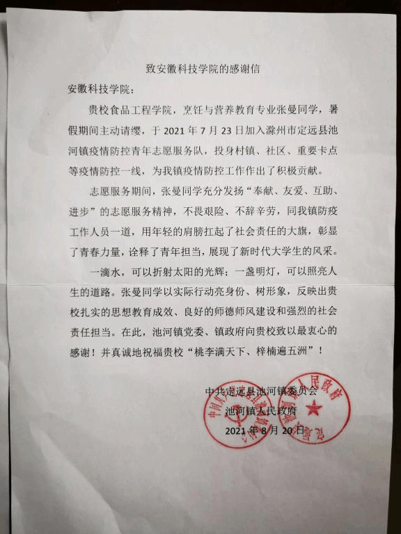 在得知定远县池河镇开展了“我为群众办实事”志愿服务活动后,来自食品工程学院烹饪与营养教育202班学生张曼和高传飞同学,便主动请缨加入当地疫情防控志愿者服务队,负责走访调查池河镇群众的新冠疫苗接种情况,了解居民的生活状况,并与其他志愿者一起宣传疫情防控相关知识与接种疫苗注意事项。