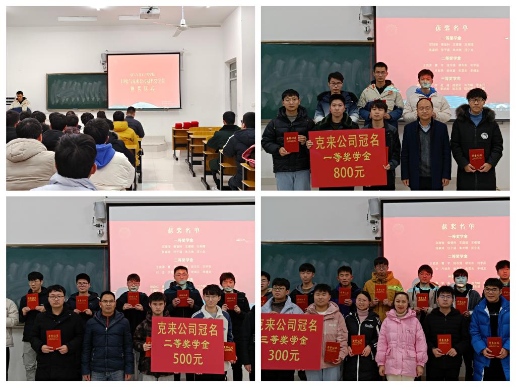 仪式上,同学们观看了克来公司的宣传视频,更加深入地了解了公司的基本情况。陈更强宣读了表彰文件及获奖名单。尚磊、陈更强、张成孜分别为一等、二等、三等奖学金获得者颁奖并合影留念。张家祥作为获奖代表发表了获奖感言,他回顾了大学的学习生活,从课业学习、学生工作及社会实践等方面讲述了自身的成长历程和生活感悟,并对克来公司和学院领导老师关心学生成长,表达了诚挚地感谢。