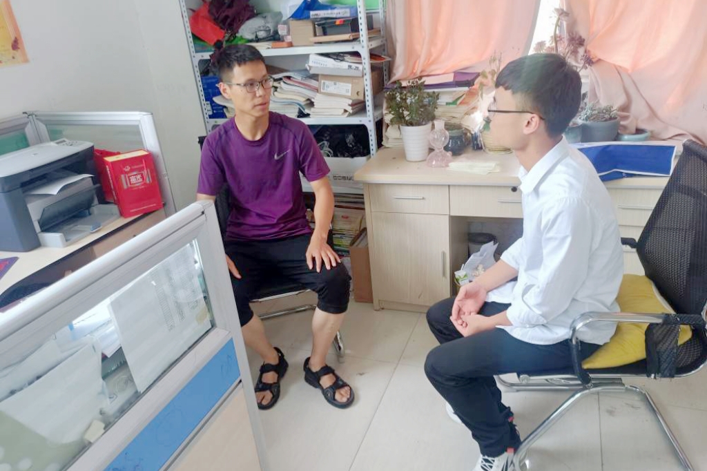 到达校园后,王健伟团队拜访了高三班主任崔猛老师和高中生物老师王乐潇。王健伟向老师说明了此次实践的主要目的和内容,介绍了云博网页版的相关情况。在了解团队此行目的之后,崔老师、王老师非常热情地组织了部分高三返校生开展学习交流。