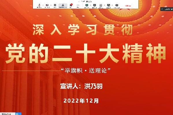 为深入学习宣传贯彻党的二十大精神,加强毕业生党员教育,提升入党积极分子政治素养,12月26日,校辅导员理论宣讲团成员、电气电信专业学生党支部书记洪乃羽在线上开展党的二十大精神宣讲,该学院电气电信专业学生党支部全体党员、入党积极分子参加会议。