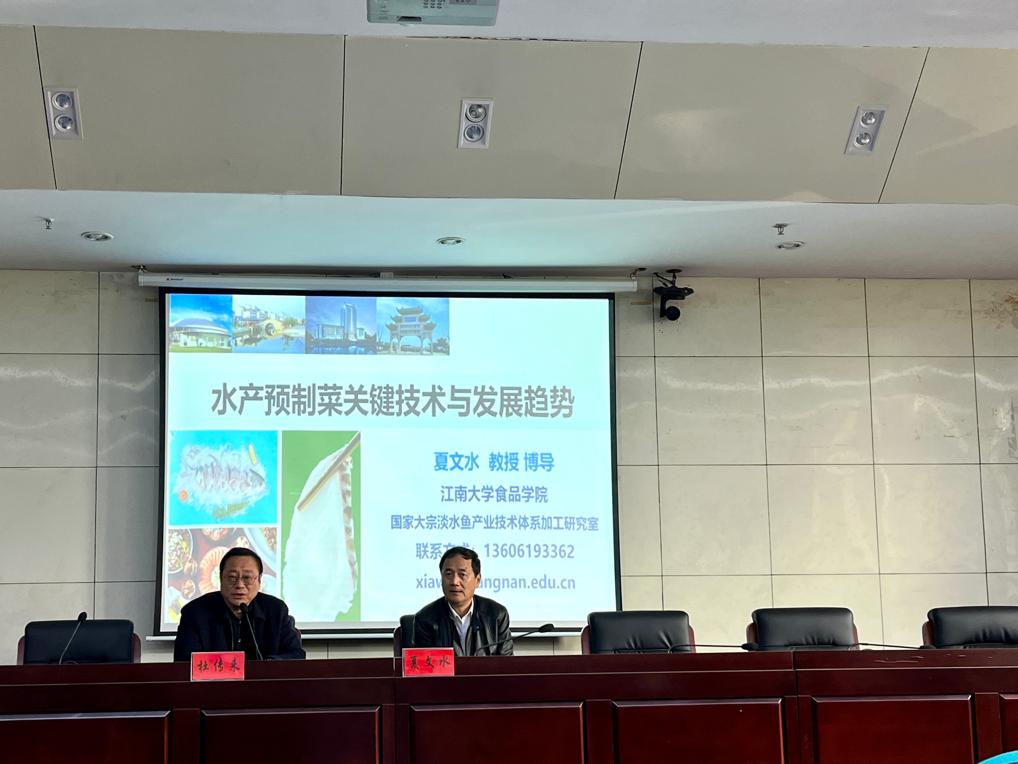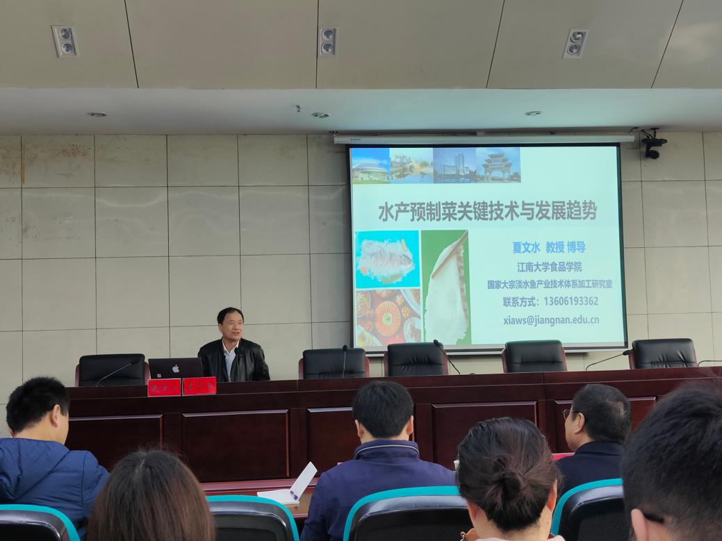 在讲座中,夏教授指出,水产预制菜是一种新型的便利食品,是通过将水产品进行加工和处理后制成的菜品。目前,水产预制菜产业已经得到了广泛的发展,市场需求量不断增长。在介绍产业现状的同时,夏教授还指出,水产预制菜的关键技术包括原料选择、加工工艺、包装保鲜等方面。他深入浅出地讲解了这些技术的应用和意义,并展示了一系列成功案例,使得学院师生对水产预制菜有了更深入的了解。