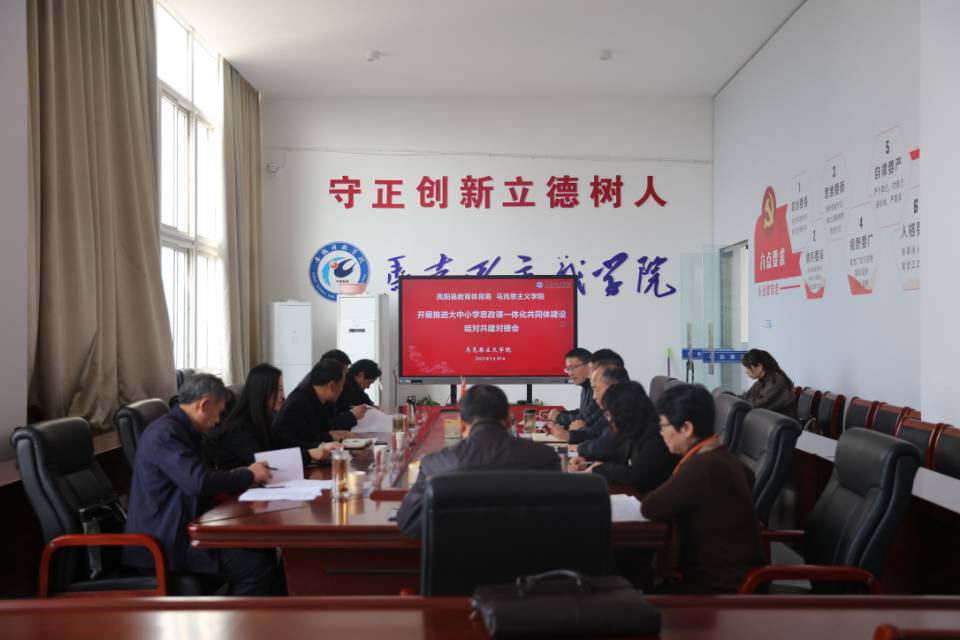 为深入贯彻落实党的二十大精神,全面推进大中小学思政教育一体化建设,充分发挥学校思政课立德树人关键课程作用,切实提升思政教育铸魂育人实效,3月30日上午,凤阳县委教体工委书记、教育体育局局长刘文春,教体工委副书记顾斌一行,来到云博网页版马克思主义学院学术交流中心与我院开展推进大中小学思政课一体化共同体建设结对共建对接会。对接会由马克思主义学院党总支副书记、院长张德化主持,马克思主义学院党总支书记杨仕勇,副院长张栋等出席会议。