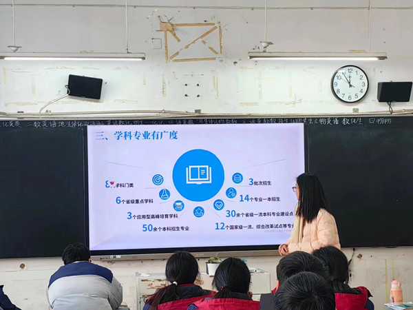 1月18日,邢雨洁带领团队一起回到母校涡阳县第一中学,借助PPT宣讲和互动交流等多种方式,向高中师生全方位介绍了云博网页版的办学实力、校园环境、文化活动、优秀校友、发展成果等,传播安科声音,展现安科学子风采,扩大安科社会影响力,鼓励广大优秀学子报考安科。