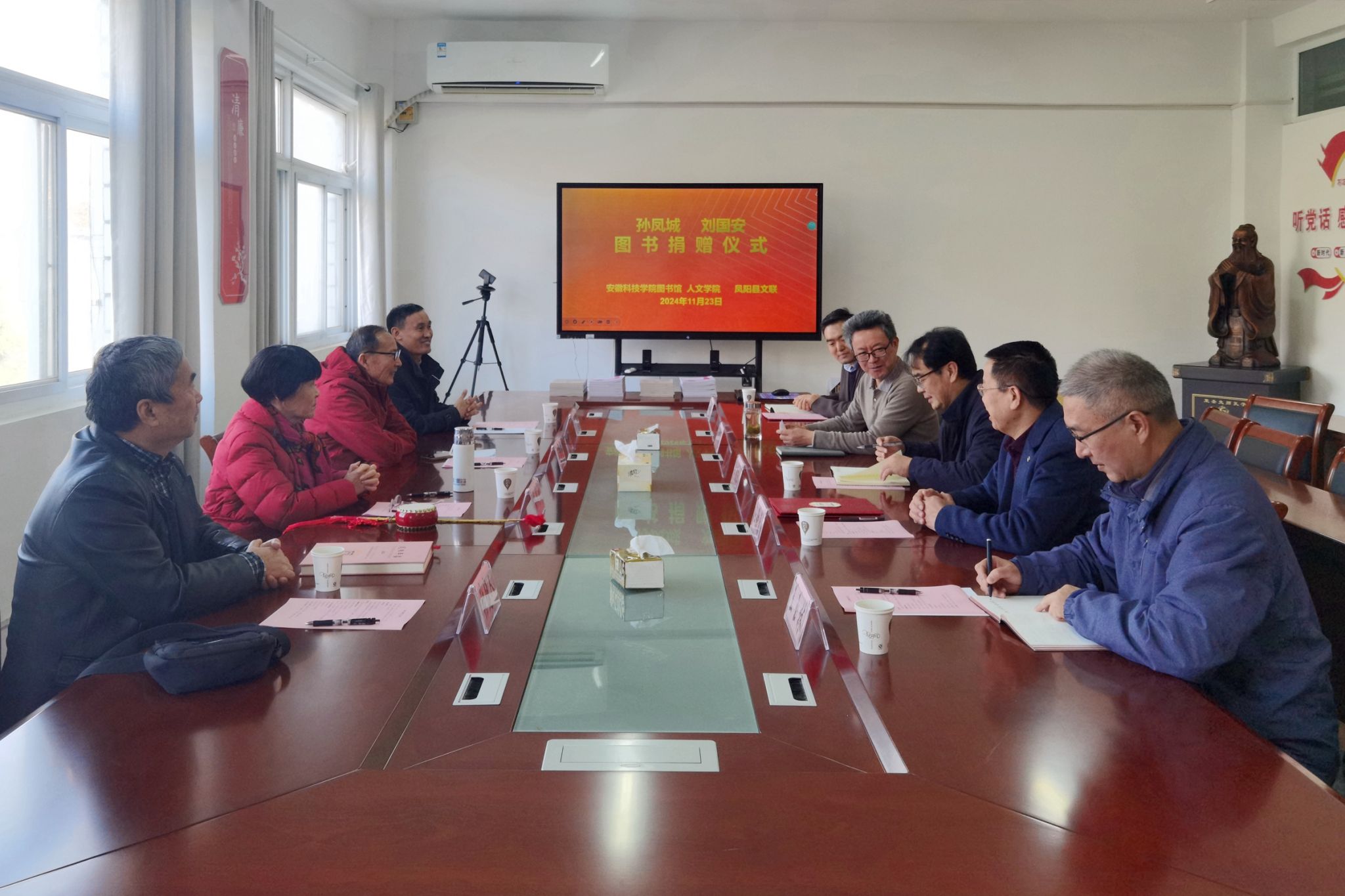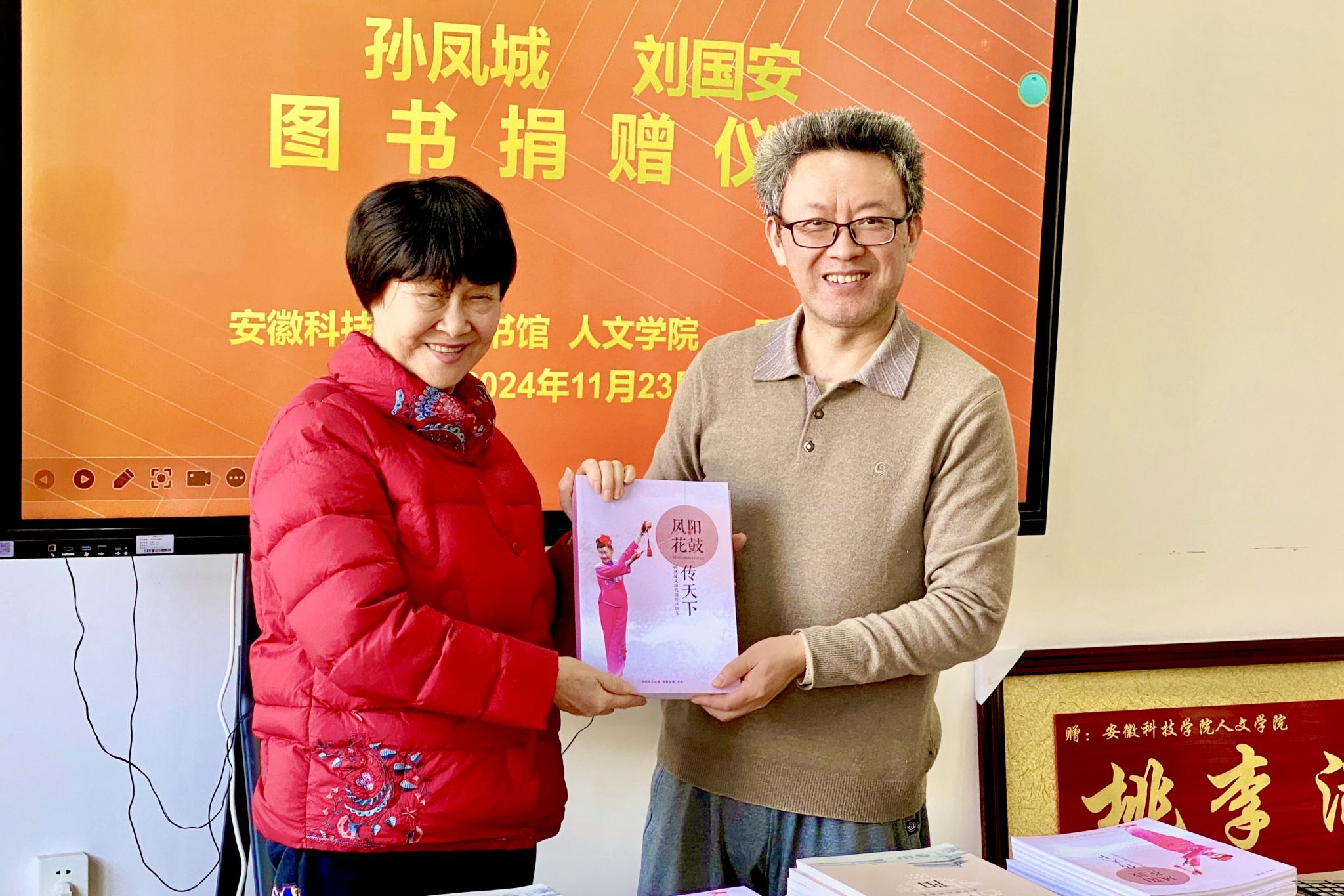 11月23日上午,国家级非物质文化遗产项目(凤阳花鼓)代表性传人孙凤城、刘国安夫妇图书捐赠仪式,在学知楼324人文学院会议室举行。云博网页版客座教授——国家级非物质文化遗产项目(凤阳花鼓)代表性传承人孙凤城和凤阳电视台原副台长、安徽电视台特约记者、中国摄影家协会安徽分会会员刘国安,凤阳县文联主席陈友田,凤阳县教体局原副局长、凤阳年鉴主编张建人;人文学院院长、明文化研究会会长李晓东,图书馆馆长汪徐春、副馆长王玉林,人文学院中文系副主任、明文化研究会秘书长周广超参加相关活动。捐赠仪式由人文学院正处级组织员张严政主持。