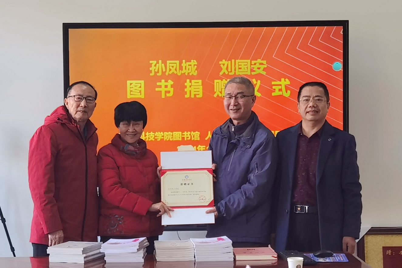 在图书捐赠仪式上,张严政、周广超和汪徐春、王玉林,分别代表人文学院和图书馆,接受孙凤城、刘国安夫妇和张建人捐赠的图书,并为其颁发捐赠证书。(特约通讯员:高晓宁 摄影:高晓宁 审核:张严政 李晓东 编辑:李锦)