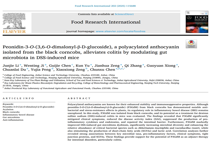 近日,食品科学与工程学院陈春旭副教授以通讯作者身份在国际Top期刊《Food Research International》(Q1,影响因子7.0)发表了题为“Peonidin-3-O-(3,6-O-dimalonyl-β-D-glucoside), a polyacylated anthocyanin isolated from the black corncobs, alleviates colitis by modulating gut microbiota in DSS-induced mice”的高水平研究论文,展现了新年新气象。该论文的第一作者为2022级食品加工与安全专业硕士研究生李俊杰,云博网页版为论文第一完成单位,南京农业大学曾晓雄教授课题组为合作单位。