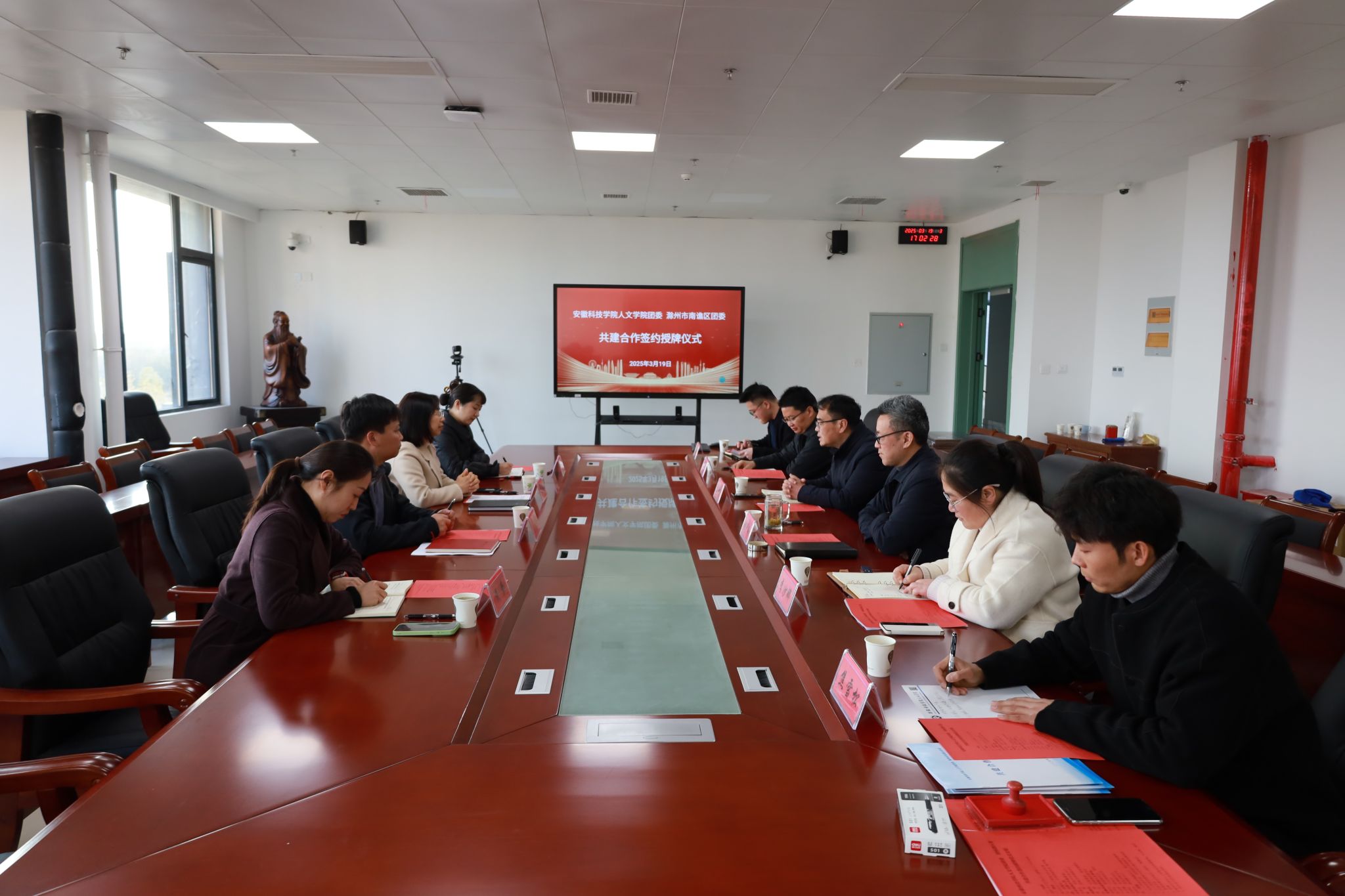 为推进校地团学资源融合,实现优势互补、合作共赢,3月19日下午,人文学院团委与滁州市南谯区团委举行共建合作签约授牌仪式。共青团滁州市委书记李国金,副书记戴莺,南谯区委常委、组织部部长程娟,共青团南谯区委书记徐迟,学院党委副书记、院长李晓东,正处级组织员张严政,副院长牛永辉,党委副书记李沙娜,党政办副主任方明旺,团委副书记焦雪松等出席,仪式由张严政主持。