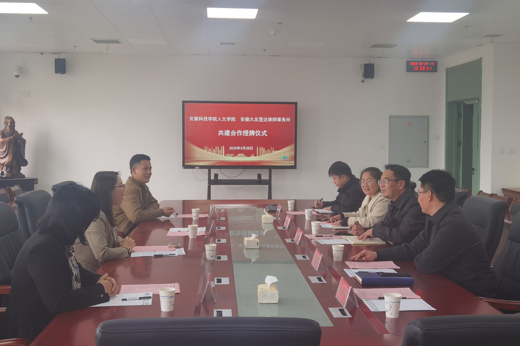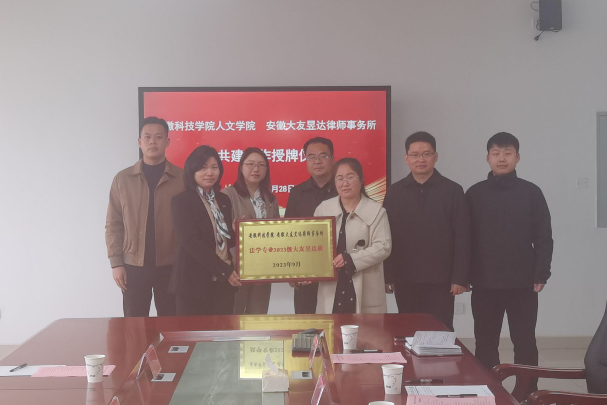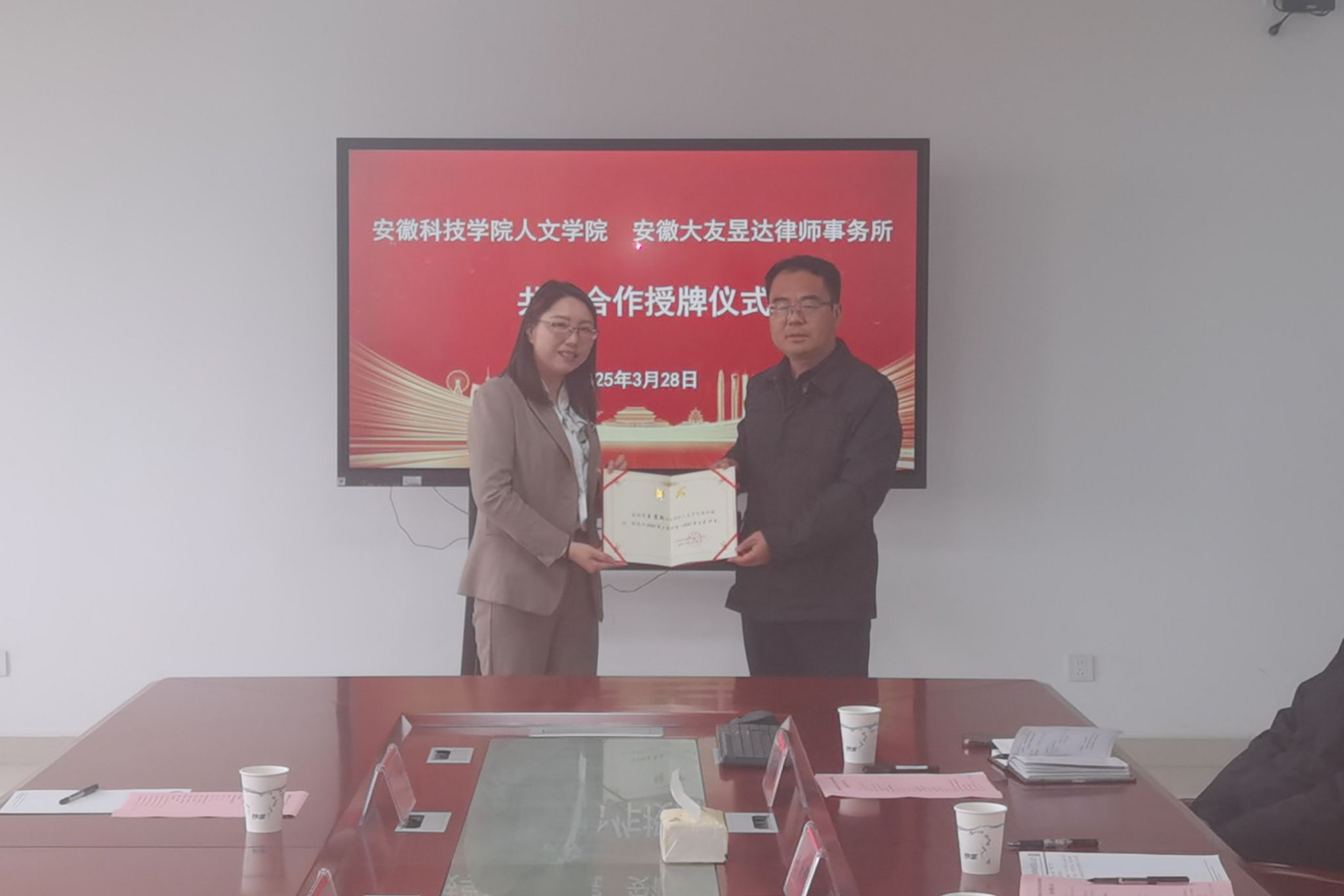 3月28日下午,人文学院与安徽大友昱达律师事务所在人文学院313会议室举行共建合作授牌仪式。安徽大友昱达律师事务所主任王苏敏,合伙人安鹃,律师杨祉龙;人文学院党委副书记、院长李晓东,副院长牛永辉,党委副书记李沙娜,法学系教授骆绪刚,专职辅导员徐琦琦出席。仪式由牛永辉主持。
