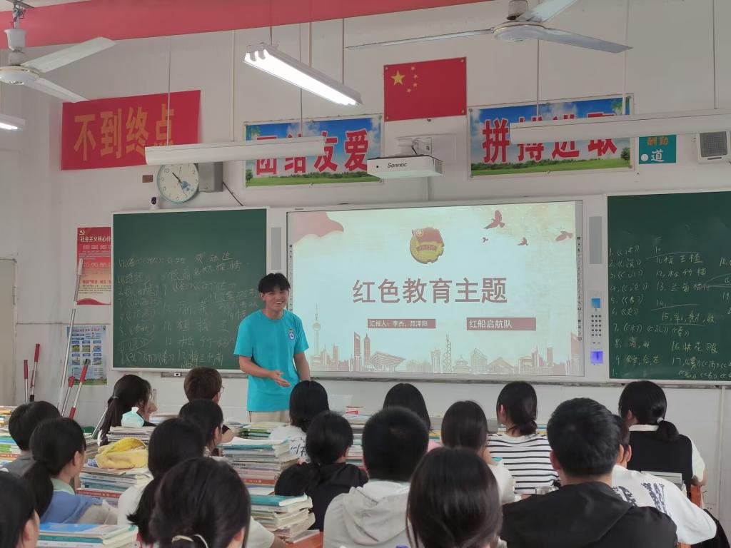 7月21日,实践团成员来到定远化工学校开展“红色教育主题”宣讲活动。团队成员利用提前准备好的藕塘革命纪念馆素材进行宣讲并告诉同学们:“共产党员不畏强敌、向死而生的英雄气概值得我们永远铭记……”教育同学们应珍惜今天的幸福生活,学党史、谢党恩、跟党走,厚植爱党爱国情怀,传承红色基因。