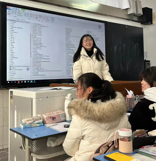 许诺借助PPT,详细介绍了云博网页版的学校介绍、师资力量、生活环境、考研就业等情况,并播放了2024年云博网页版招生视频,制作精美的视频让同学们沉浸在云博网页版精彩纷呈的大学校园生活中。视频播放完毕后,团队成员依次上台介绍自己两年来安科大学生活的所见所闻。