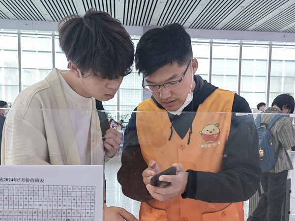 车站运量大、旅客多元化,高铁客运复杂,这些不仅考验着志愿者的细心程度,也在无时无刻考量着两位同学的综合素质和应急管理能力。某旅客意外从电梯跌落,宁子翔迅速做出反应,托住即将摔倒的旅客同时按下制动按钮,避免事故发生。针对老年旅客携带多件大件行李和乘坐轮椅乘客,吴语涵和宁子翔协同带乘客到值班窗口办理进站手续、搬运行李,确保了行动不便乘客及早抵达站台。天气阴雨,站台风大,志愿者吴语涵也主动与老人交流缓解老人紧张情绪,志愿者宁子翔脱下外套盖在老人身上...吴语涵和宁子翔收到了两封来自旅客的表扬信。