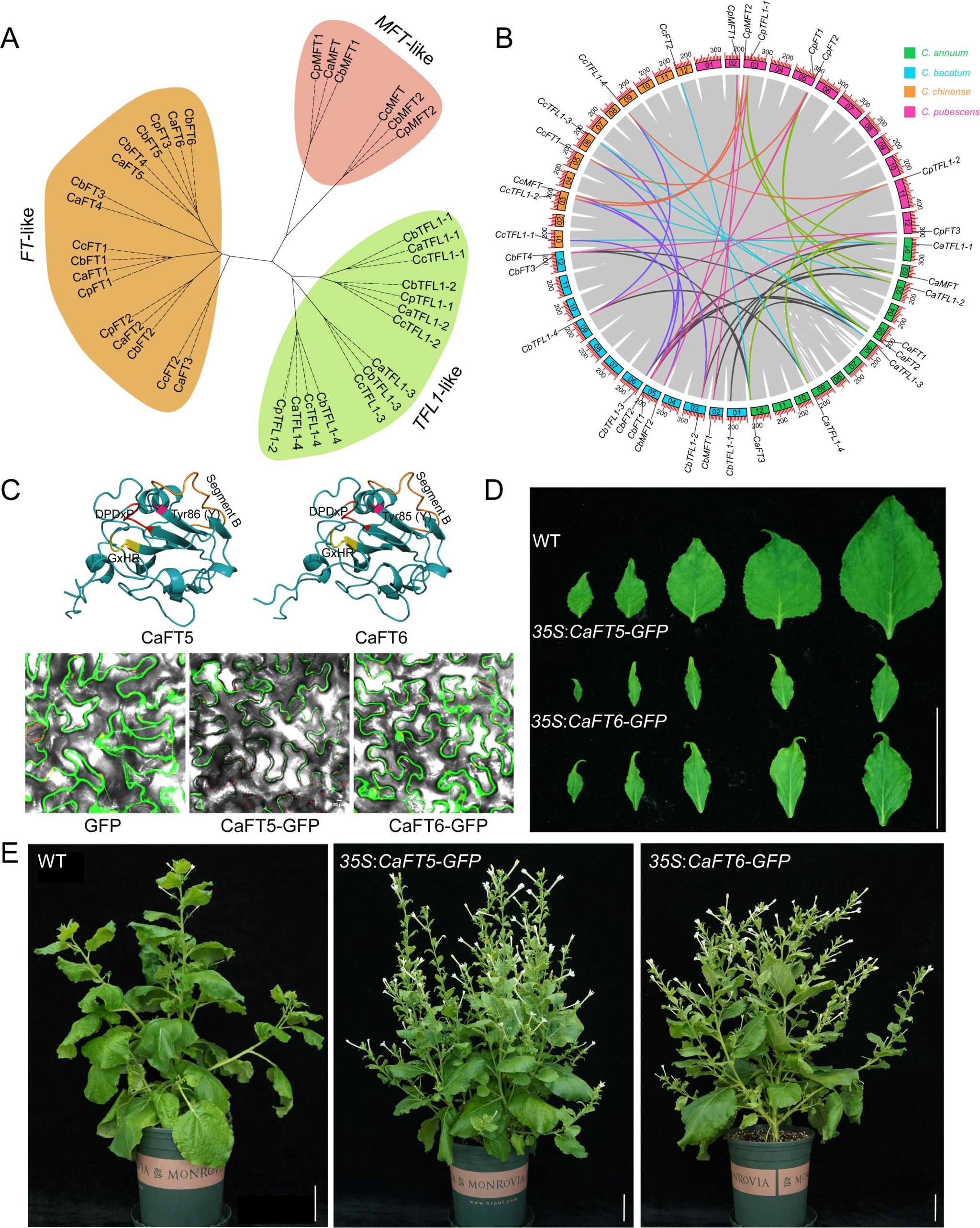 一年生辣椒6个CaFT蛋白均是细胞质和细胞核定位的蛋白,并且与AtFT、SP3D具有高度相似的3D结构及相同低的分化速率。CaFT5和CaFT6是一对重复基因对,在本氏烟草(Nicotiana benthamiana)中过量表达CaFT5和CaFT6,转基因烟草不仅表现出明显的早花,而且叶片和枝条数量显著增加,叶片大小明显变小。表明CaFT与成花素基因一样,在调节开花时间和植物结构方面具有保守的功能,并且在辣椒发育中发挥着多重作用。本研究不仅拓宽了茄科植物成花素-反花素系统的研究,为进一步利用该组份在辣椒中进行遗传改良奠定了理论基础,具有重要的应用价值。