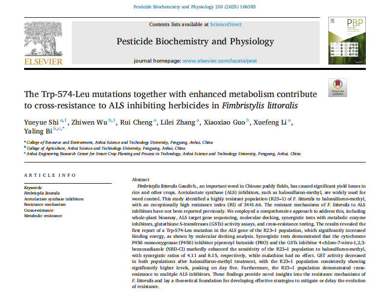 近日,我校农学院毕亚玲教授团队在国际知名期刊《Pesticide Biochemistry and Physiology》(中科院一区Top期刊,IF=4.2)发表了题为“The Trp-574-Leu mutations together with enhanced metabolism contribute to cross-resistance to ALS inhibiting herbicides inFimbristylis littoralis”的研究论文。该研究首次揭示了稻田恶性杂草水虱草(Fimbristylis littoralis Gaudich.)对乙酰乳酸合成酶(ALS)抑制剂类除草剂的抗性机制。硕士研究生史悦悦和青年教师吴志文博士为共同第一作者,毕亚玲教授为通讯作者,云博网页版为唯一完成单位。