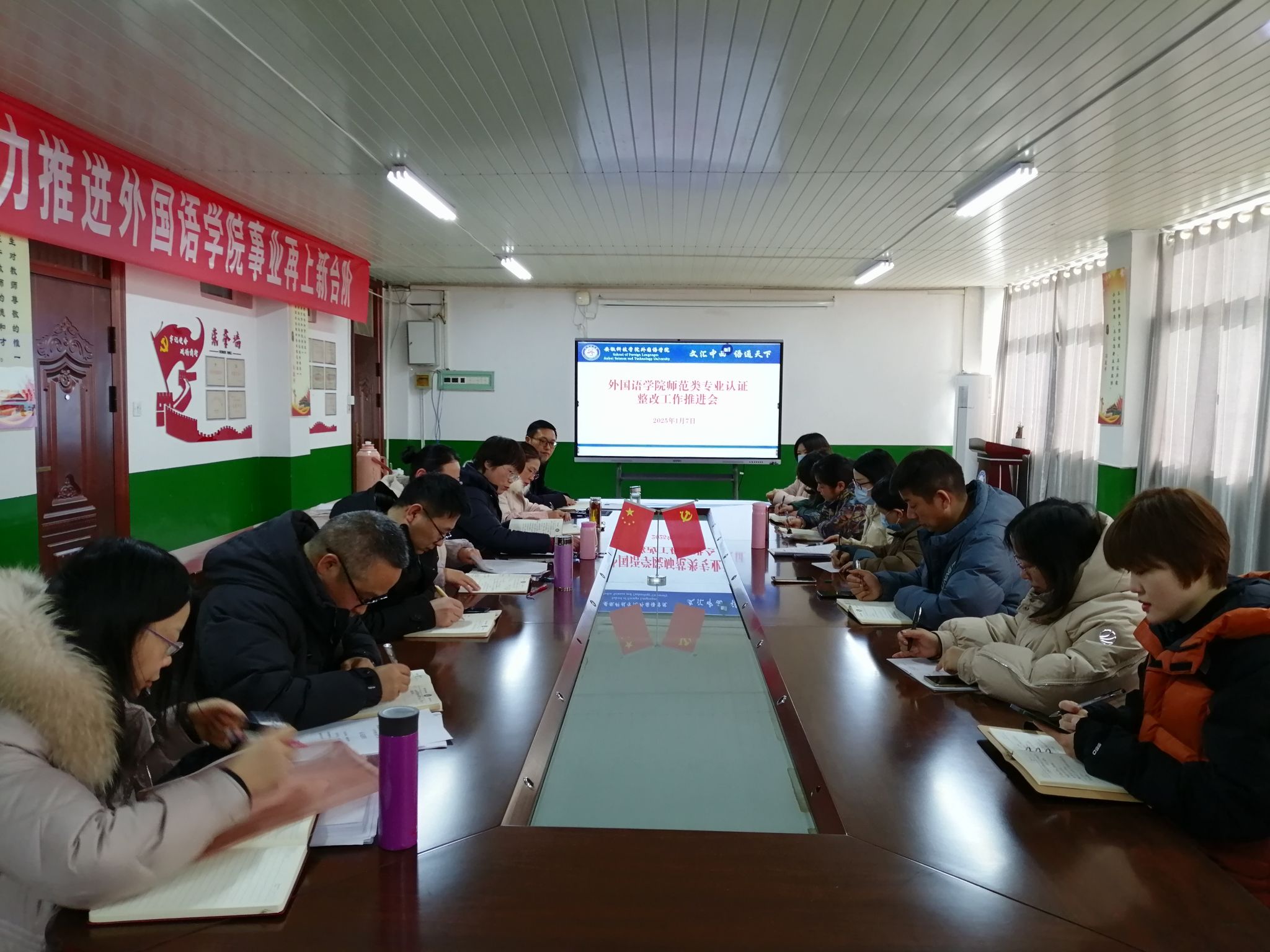 为扎实推进英语(师范)专业认证的持续整改工作,深入贯彻落实“学生中心、产出导向、持续改进”的认证理念,确保师范专业认证工作能出成绩、见实效。按照教务处工作安排,1月7日下午,外国语学院在学院会议室召开了专业认证整改工作推进会。会议由外国语学院院长刘萍主持,学院党政领导和英语专业教研室全体教师参加了会议。