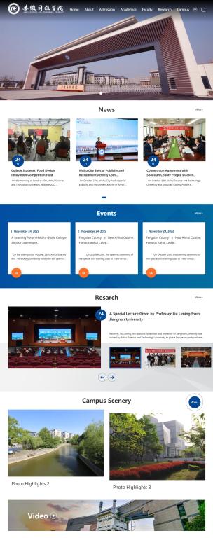 学校英文门户网站设有“About”、“News”、“Events”、“Resarch”、“CampusScenery”等5大板块,下设13个二级栏目。