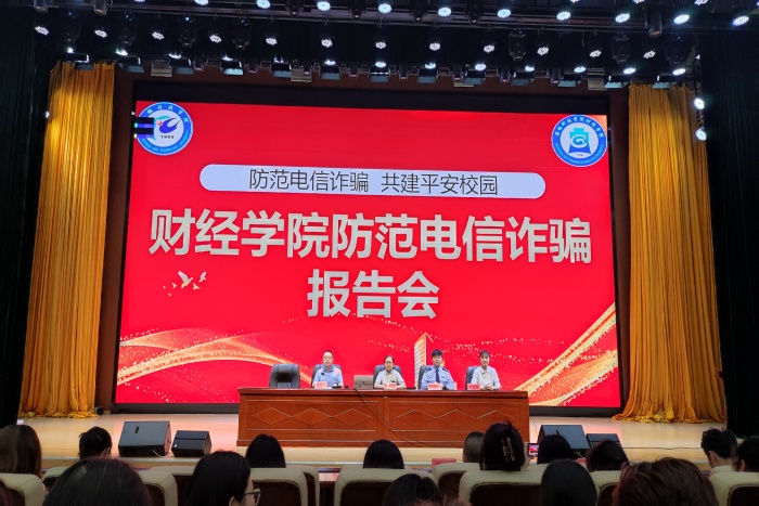 为提高师生防范电信网络诈骗意识,引导师生树立理性消费观,营造浓厚校园防诈反诈氛围,5月29日下午,财经学院联合蚌埠市龙子湖分局反诈中队、邮政储蓄银行蚌埠分行共同举办了金融知识进校园反诈宣传主题活动。财经学院党委副书记耿广汉出席并主持,2023级和2022级全体学生参加。