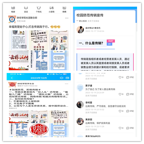 多组织宣传,联合发力。财经学院学生会、院社团联合会、院易班工作站利用网络平台进行宣传,介绍传销的性质、主要表现形式、危害、大学生应该如何防范传销等知识。同学们纷纷进行进行点赞、评论和转发。