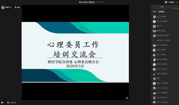 为进一步提升大学生心理健康与安全意识,提高心理健康帮扶能力,加强朋辈帮扶作用发挥,财经学院于5月25日举办线上心理委员培训讲座,学院各班级心理委员、心联成员参会。本次交流培训会由学院心联主席黄芳主持。