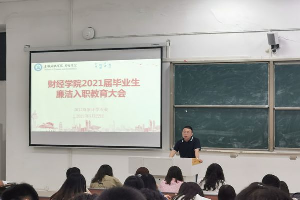 为引导和教育毕业生做好入职准备,增强拒腐防变、抵御风险能力,自觉坚守道德和法律底线,扎实走好迈入社会的第一步,5月22日晚,财经学院分专业对学院共四个专业的全体毕业生开展廉洁入职教育,2021届全体毕业生参加会议,学院党委书记杜小明、党委副书记耿广汉、各班级辅导员出席会议,会议由耿广汉主持。