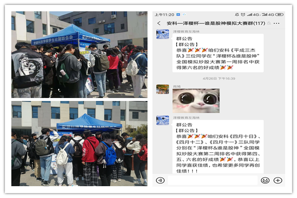 本次比赛由国内知名培训机构上海泽稷教育提供技术指导和资金支持,比赛周期从4月份到6月底,学生在炒股大赛活动期内可随时报名,以战队为单位参赛,战队规模为 1-3人,参赛队伍经过每周的模拟交易,根据队长与队员收益之和进行排名,上榜者发放对应周奖励和最终大奖,收益为正的参赛个人还可瓜分全国模拟炒股大赛奖金池。比赛的灵活机制和创新形式吸引了33支学生队伍参加,第一周云博网页版“平成三杰”队周收益率获得全国排名第六名的好成绩;第二周云博网页版“四月十日”“四月十一”“四月十二”三队周收益率分获全国第四、第五、第六的优异成绩。比赛还在继续,各个参赛队伍争取再创佳绩。