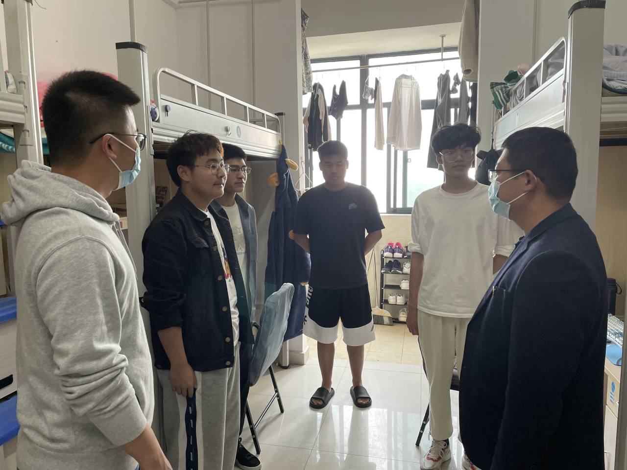 走访过程中,领导老师与学生亲切交谈,了解学生的清明假期的活动安排和疫情期间的生活学习。叮嘱学生要严格按照学校防疫工作通知要求,及时关注学校防疫工作动态,配合学校做好相关防疫工作。提醒同学们做好自身体晨午检工作,保持宿舍干净卫生,注意个人防护。