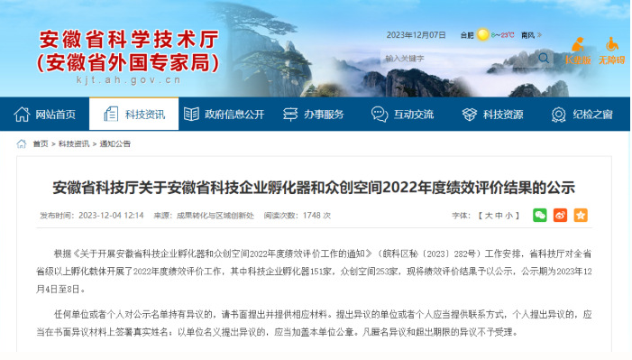 近日,安徽省科学技术厅发布《安徽省科技企业孵化器和众创空间2022年度绩效评价》结果,我校运营的省级众创空间“零壹双创孵化基地”获优秀等次。