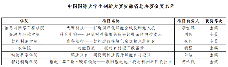 近日,安徽省大学生创新大赛(2025)获奖名单公布,我校共获奖48项,其中参赛项目“天穹科技——打造国产化双能全域反制无人机”等6个项目获省赛金奖,“神机妙彘——生猪智慧养殖装备行业领跑者”等14个项目获省赛银奖,“智联碳控——智控节能搭快车,助力全球双碳目标”等28个项目获省赛铜奖。省赛金奖数量及获奖总数在省内地方应用型高校中排在前列,陈建国、李同杰、朱琳、吴燕、叶鹏飞、查文珂六位教师获优秀创新创业导师奖。