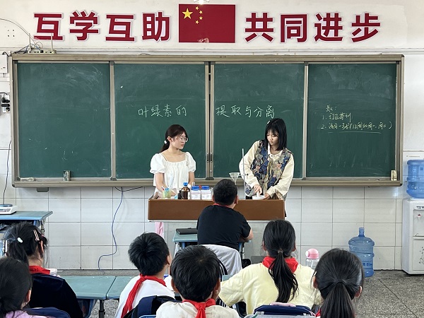 在此次实践活动中志愿者们带领学生们开展了一场生动有趣的科学课程,“叶绿素的提取与分离”实验。课上,志愿者向他们解释实验的原理,介绍实验的步骤及叶绿素的组成,互动环节,学生们跃跃欲试,亲身参与其中,剪叶片、研磨叶片、制作层析条,观察现象,提出问题,共同探索。在志愿者的讲解下他们了解到科学知识,在自己的实践中培养了动手能力,深刻地领悟到科学的魅力。
